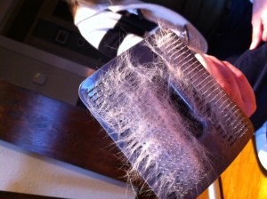 Lucy getting groomed. All that hair from one little dog.